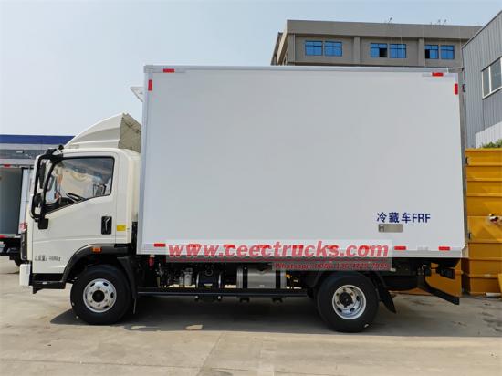 HOWO 4x2 koelwagen, deze is aangepast op het HOWO Leader-serie lichte vrachtwagenchassis, 3360 mm wielbasis, uitgerust met Weichai WP3NQ160E61 160 pk motor, Xingrui ML650A 6-versnellingsbak, bovenste koelbak 4100×2300×Afmetingen van 2050 mm, glasvezelmateriaal, FRP + PU-schuim + 105 mm FRP-paneelmateriaal, volledig gesloten sandwichpaneel, rechterdeur, dubbele achterdeur van normaal formaat, antislip- en slijtvaste vloer, Carrier CITIMAX D6 onafhankelijke koelunit.