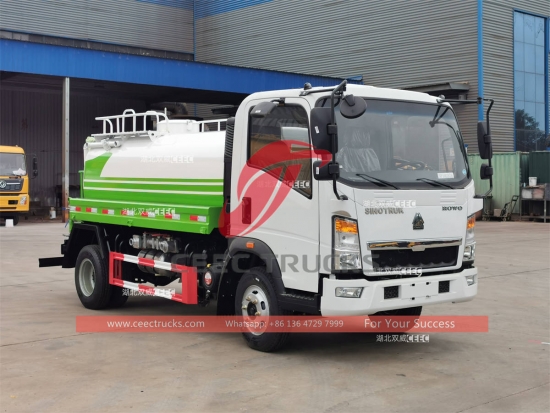 HOWO 5.000L waterwagen, Sinotruk Howo 4x2 lichtgewicht chassis, handgeschakelde 5-versnellingsbak, beroemde 116 pk dieselmotor, waterpomp van een bekend Chinees merk, met sproeikop voor, midden en achter.