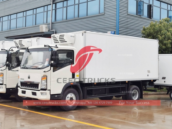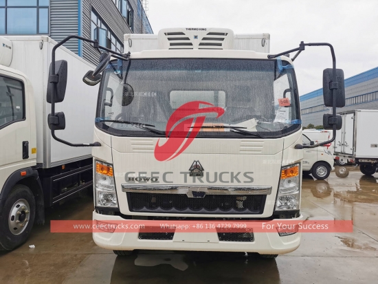 HOWO 5-tons vrieswagen, HOWO linksgestuurd model 4×2 chassis, WLY handgeschakelde zesversnellingsbak, YUNNEI 116 pk motor. Uitgerust met THERMO KING koelunits voor hoge prestaties, de capaciteit van de bestelwagen kan optioneel worden uitgebreid met 3-25 ton.