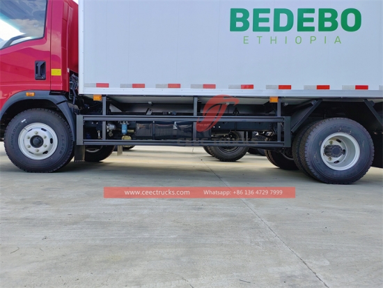 HOWO 5-tons vrieswagen, HOWO linksgestuurd model 4×2 chassis, WLY handgeschakelde zesversnellingsbak, YUNNEI 116 pk motor. Uitgerust met THERMO KING koelunits voor hoge prestaties, de capaciteit van de bestelwagen kan optioneel worden uitgebreid met 3-25 ton.