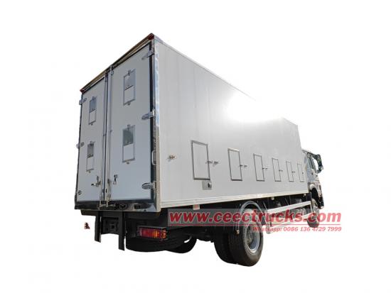De Howo 4x2 koelwagen maakt gebruik van het nieuwe Howo HW76 chassis met voorcabine en een wielbasis van 4600 mm. Hij is uitgerust met een Weichai WP10.340E22 motor van 340 pk en een Sinotruk HW19710 tienversnellingsbak. De koelwagen heeft een laadvermogen van 6500 kg. × 2350 × 2500 mm, gemaakt van glasvezel met een FRP + PU-schuim + 105 mm FRP-paneelmateriaal, met een volledig gesloten sandwichpaneel, een deur die aan de rechterkant opengaat, grote dubbele achterdeuren en een antislip, slijtvaste vloer. De unit is voorzien van een CARRIER CITIMAX 1100 onafhankelijke koelunit.