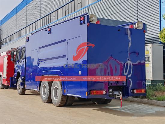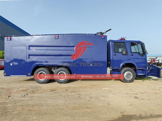 High-strength aluminum alloy or titanium alloy framesHowo 6x4 anti-oproerwaterkanonvoertuigmaakt gebruik van een volledig explosieveilig ontwerp van materialen, constructies en systemen om een veilige en efficiënte uitvoering van taken in extreme omgevingen te garanderen.De chauffeur moet zowel over speciale rijvaardigheden als over noodhulpcapaciteiten beschikken, en zijn inzet richt zich meer op preventieve veiligheidsmaatregelen en samenwerking op afstand. De Howo gepantserde oproerwagen is een onmisbaar veiligheidsmiddel in de petroleum- en chemische industrie, enzovoort.