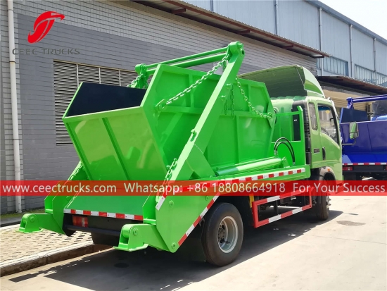 HOWO 6cbm portaalarm vuilniswagen, HOWO 4x2 RHD chassis, handgeschakelde zesversnellingsbak, 120 pk dieselmotor, hoogwaardig stalen zwenkarmsysteem, hydraulische bediening en elektrische bedieningskast optioneel. Alle lak en logo's zijn naar wens aan te passen.