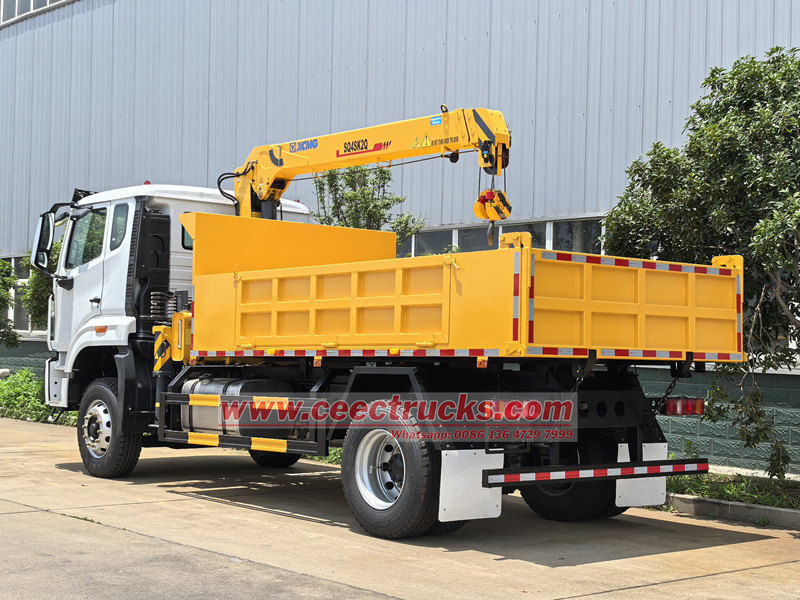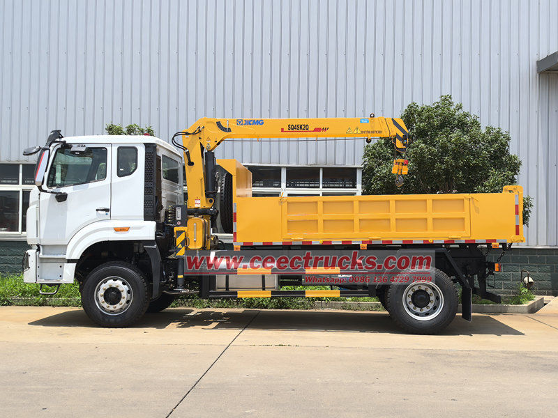 De HOWO enkelassige 4-tons autolaadkraan is geschikt voor toepassingen in de bouw, logistiek, infrastructuur, mijnbouw en andere sectoren. Het voertuig is aangepast op het HOWO-chassis met een wielbasis van 4600 mm. Hij is uitgerust met een WEICHAI WP10.300E22-motor van 300 pk en een HW13710-versnellingsbak met 10 versnellingen. Het bovenste deel bestaat uit een laadbak van 3800 × 2400 × 450 mm en een XCMG SQ4SK2Q-kraan met een hijsvermogen van 4 ton. De kraan kan worden bediend met hydraulische hendels aan beide zijden om het in- en uitschuiven van de stempels en het in- en uitschuiven van de kraan te regelen.