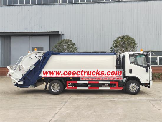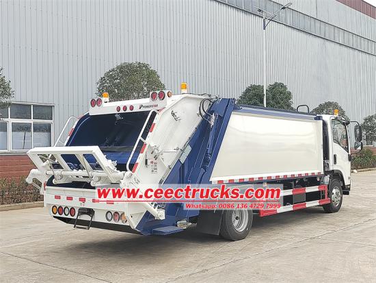 Isuzu 700P chassis,10cbm garbage capacityDe Isuzu 10 CBM split body achterlader vrachtwagen vertegenwoordigt een vuilniscompressievoertuig dat zich kenmerkt door zijn indrukwekkende compressieverhouding, aanzienlijke laadcapaciteit, snelle operationele efficiëntie en beperkte geluidsniveaus.Aangedreven door een krachtige dieselmotor, wordt het laadmechanisme aan de achterzijde hydraulisch bediend. De hydraulische arm zorgt voor het heffen en legen van de afvalbak, terwijl het interne compressiesysteem het afval compact samenperst, waardoor de laadcapaciteit wordt vergroot en de efficiëntie van de afvalverwerking wordt geoptimaliseerd.