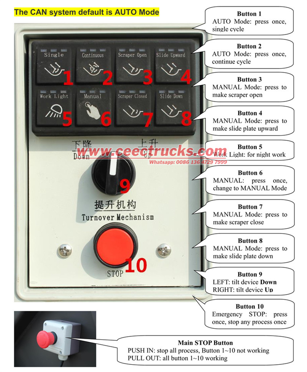 9. Voor vuilniswagens die zijn uitgerust met een externe motor als aandrijving, wordt de openings- en sluitingstijd van de schraper aangepast aan de stroomsnelheid van het systeem. Bij gebruik van de chassismotor is de openings- en sluitingstijd van de schraper korter dan die van het motoraandrijfsysteem, en is het normaal dat de schraper kort pauzeert wanneer de schraper opent en sluit.
