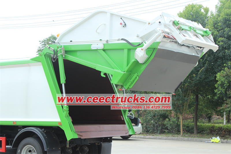De Isuzu 10 kubieke meter NPR-afvalpers is een speciaal voertuig dat is ontworpen voor het ophalen en vervoeren van afval. De auto is gebouwd op het Japanse Isuzu NPR-chassis, is solide en stabiel en biedt een goed draagvermogen en rijstabiliteit.De verdichtingscarrosserie heeft een gestroomlijnd boogvormig ontwerp met een volume van 10 kubieke meter (ofwel 13 yard). Hij is volledig gemaakt van hoogwaardige mangaanstalen platen. Het volledige lasproces garandeert een stevige en duurzame bak zonder risico op lekkage. De Isuzu achterladers met verdichtingscarrosserie en trechter kunnen ook op maat worden gemaakt van HARDOX-materiaal, met een dikte van 4 mm voor zij- en vloer.