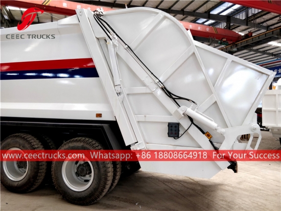 ISUZU 20cbm compressieafvalvoertuig, het vrachtwagenchassis is voorzien van een ISUZU 300 pk dieselmotor en een snelle 9-versnellingsbak. PLC-bedieningskast voor eenvoudige bediening. Alle lak en logo's worden naar wens van de klant geleverd.