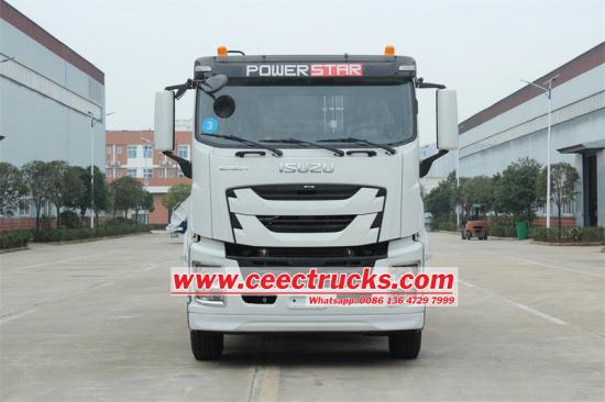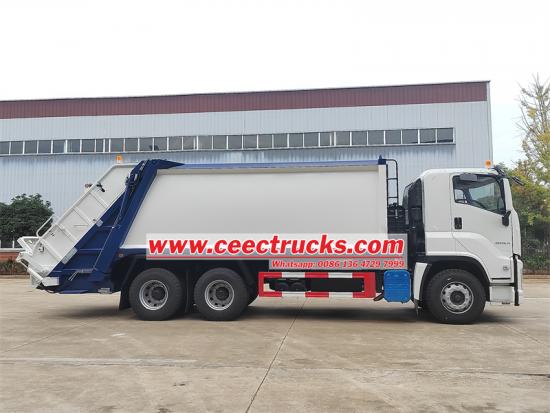 De Isuzu 25 cbm heavy duty achterlader is uitgerust met een Isuzu GIGA VC61 6X4 cabinechassis, uitgerust met een USB-interface, radio en airconditioning, een wielbasis van 4600+1370 mm, een 6UZ1-TCG61 380HP motor, een FAST 12-versnellingsbak, een Euro 6 cilinderinhoud van 9839 ml, de bovenste carrosserie is een 25 cbm boogvormige vuilnisbak, gemaakt van koolstofstaal, met zijkanten 4 en bodem 5 diktes, antiroestbehandeling aan de binnen- en buitenkant en maakt gebruik van een CAN-BUS elektronisch besturingssysteem en hydraulisch klepbedieningssysteem.