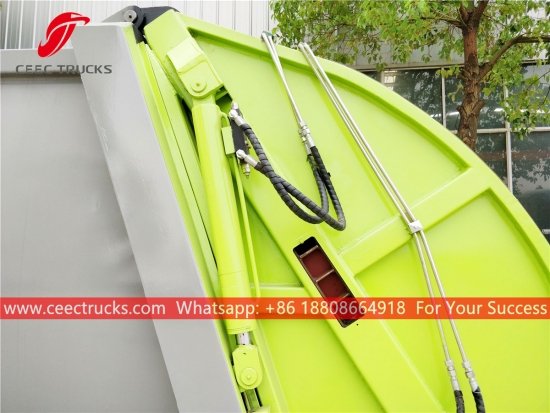 ISUZU 4m3Vuilniswagen met achterlaadfunctie, het chassis is voorzien van een ISUZU 98 pk dieselmotor en een MSB 5-versnellingsbak. PLC-bedieningskast voor eenvoudige bediening. Alle lak en logo's worden naar wens van de klant geleverd.