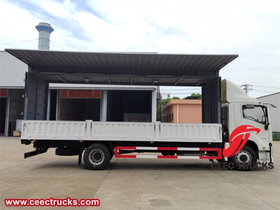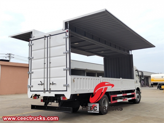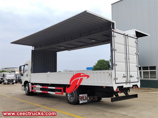 De Isuzu Giga 4x2 205 pk zeswieler Wing Van Truck, ook wel bekend als een 'wing-opener', is een verbetering ten opzichte van gewone bestelwagens. Het is een speciaal voertuig dat de spatborden aan beide zijden van de carrosserie kan openen met behulp van veren, handmatige of hydraulische voorzieningen. De bovenkant, het voorpaneel en de achterdeur van de auto zijn hetzelfde als die van gegolfde bestelwagens, en de zijkant bestaat uit klappanelen, bovenste zijpanelen en onderste zijpanelen.