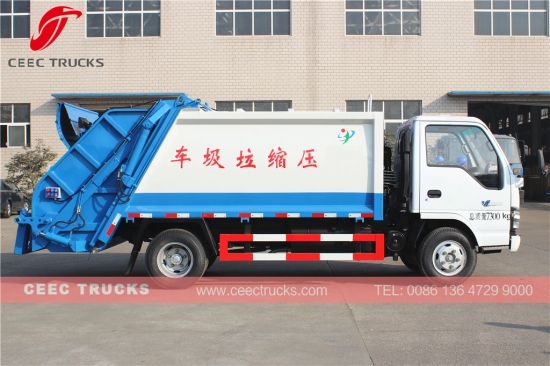 Fabrikant verkoopt rechtstreeks ISUZU 5cbm afvalcompressorwagen, ISUZU vrachtwagenchassis 4*2 model, ISUZU 4KH1-TC 120PK dieselmotor, MSB 5-versnellingsbak met handgeschakelde versnellingsbak, vergelijkbaar met 5000L afvalperstanker, die gebruikmaakt van hoogwaardig staal, dikte meer dan 5 mm, met elektrisch en hydraulisch bedieningsapparaat voor eenvoudige bediening.