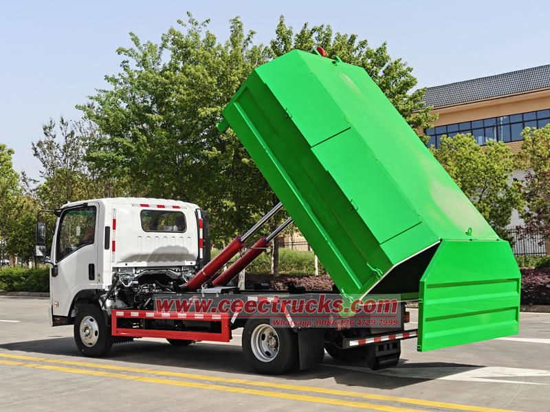 De Isuzu 5-tons roro haakarmtruck is een zeer efficiënt en betrouwbaar voertuig, ontworpen voor stedelijk en voorstedelijk afvalbeheer. Met een wielbasis van 3360 mm, een Isuzu 4HK1-TCG61 190 pk motor, Euro 6 dieselmotor met een emissie van 5.193 l, een Isuzu MLD 6-versnellingsbak, 235/75R17.5 banden met in totaal 7 stuks, airconditioning, USB, rijhulp en 3 zitplaatsen. Het onderstel en de wagen zijn afzonderlijk van elkaar gebouwd. Dankzij de hydraulische haakarm aan de achterzijde van het voertuig kunnen standaard afvalcontainers snel worden aangekoppeld en vervoerd, waardoor een circulatiemodus van "één voertuig, meerdere containers" ontstaat.