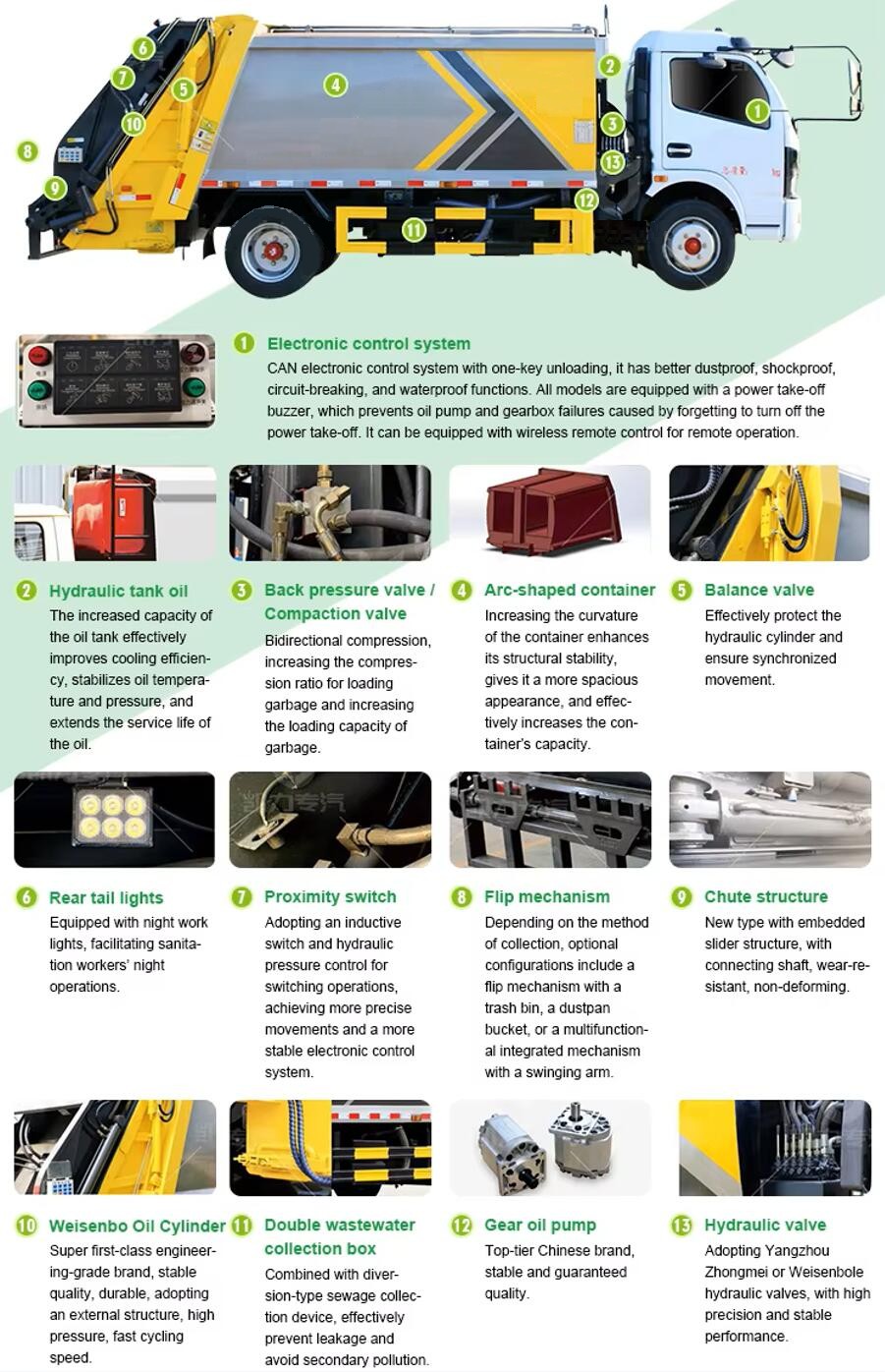 De door CEEC TRUCKS geproduceerde ISUZU NKR 6CBM achterlader, met zijn uitzonderlijke prestaties, innovatieve ontwerp en intelligente besturingssysteem, is geleidelijk een sterproduct geworden op het gebied van stedelijke reiniging. Gebouwd op het ISUZU NKR 4×2 chassis, bekend om zijn stabiliteit, duurzaamheid en wendbaarheid, heeft het voertuig totale afmetingen van 6500×2200×2500 mm, wat zorgt voor voldoende laadruimte en ook geschikt is voor de smalle straten van steden. De wielbasis van 3360 mm en de 7.00R16 bandenspecificaties dragen bij aan soepeler rijden en verbeterde handling. De ISUZU 6CBM achterlader verdichtingswagen is uitgerust met een geavanceerd CAN-bus besturingssysteem, dat logische circuits gebruikt om de sequentiële uitvoering van operationele opdrachten te garanderen en deze tegelijkertijd te koppelen om ongevallen veroorzaakt door verkeerde bediening te voorkomen, het aantal storingen te verminderen en de betrouwbaarheid te verbeteren. Een speciaal ontworpen noodremknop kan het afvalcompressiemechanisme in elke staat of positie stoppen, waardoor de veiligheid van operators en apparatuur wordt gegarandeerd.En hieronder ziet u ISUZU achterladers voor het laden van verschillende soorten afvalbakken