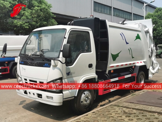 ISUZU 6cbm afvalperswagen, het chassis is voorzien van een ISUZU 130 pk dieselmotor en een MSB 5-versnellingsbak. PLC-bedieningskast voor eenvoudige bediening. Alle lak en logo's worden naar wens van de klant geleverd.
