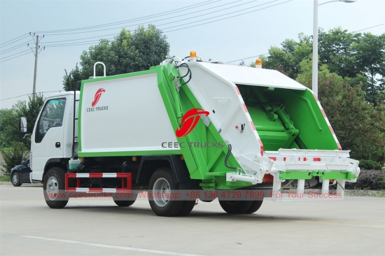 ISUZU 6cbm compressor vuilniswagen, het chassis is voorzien van een ISUZU 98 pk dieselmotor en een MSB 5-versnellingsbak. CAN-systeem bedieningskast voor eenvoudige bediening. Alle lak en logo's zijn naar wens van de klant.
