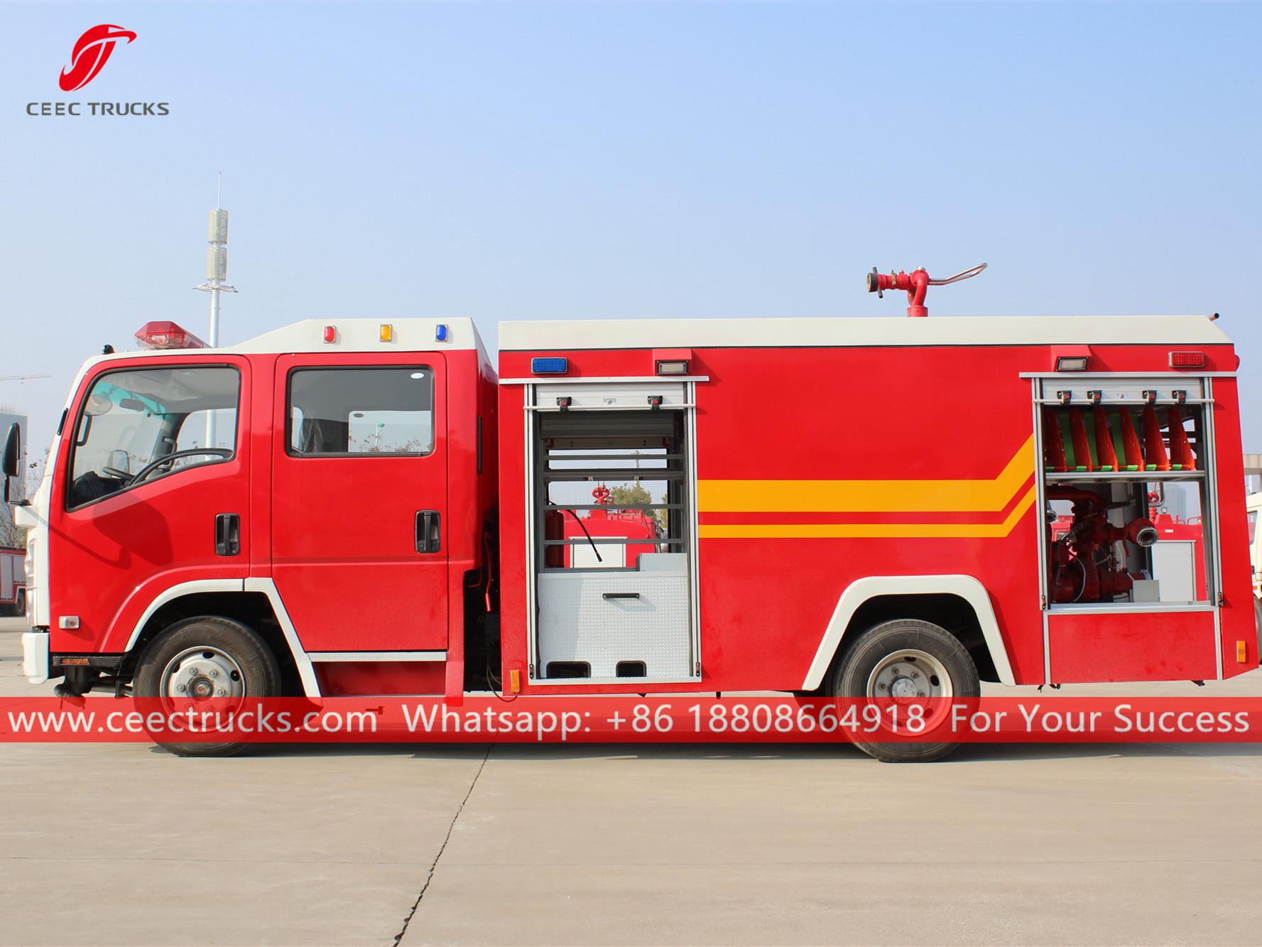 ISUZU 5CBM watertankbrandweerwagen, gebruikt ISUZU ELF linksgestuurd model, 4x2 chassis, handgeschakelde zesversnellingsbak, ISUZU 190 pk dieselmotor, watertankercapaciteit 5.000 liter, lakwerk en logo's op aanvraag.