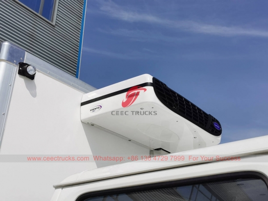ISUZU 2-tons koelwagen, ISUZU linksgestuurd model 4×2 chassis met dubbele cabine, MSB handgeschakelde 5-versnellingsbak, ISUZU 98 pk motor. Uitgerust met America Carrier koelunits voor hoge prestaties, de capaciteit van de bestelwagen kan optioneel worden uitgebreid van 2 tot 25 ton.