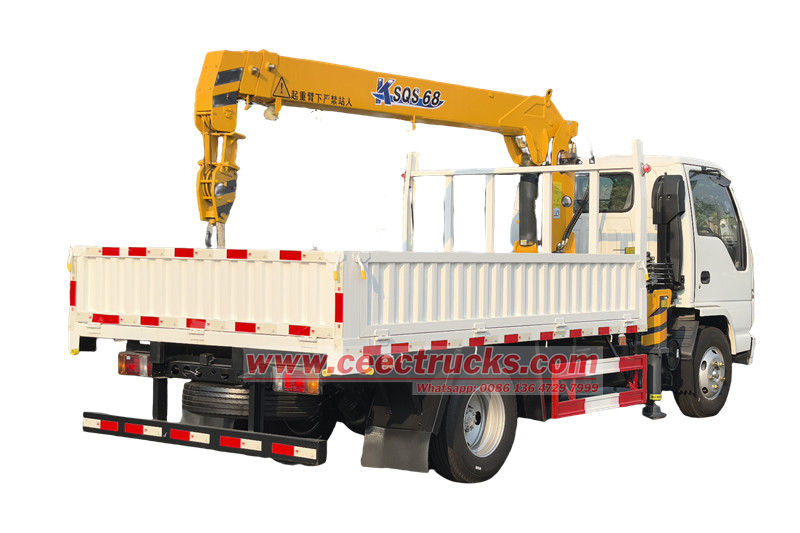 Isuzu ELF 3,2 ton vrachtwagenlaadkraan ook wel Isuzu ELF truck genoemd met 3,2 ton kraanlift, telescopische kraanwagen, servicegiekwagen, op een telescopische giek gemonteerde kraan, enz. Het voertuig is aangepast op het chassis van een Isuzu 100P en is uitgerust met een krachtige Isuzu 4KH1CN6LB 120 pk-motor, gekoppeld aan een MSB 5-versnellingsbak, soepel schakelen en een SQS-68-kraan aan de achterkant van de carrosserie, met een groot hefvermogen en bereik, en een laadbak van 3000x2100x450 mm eronder, die gemakkelijk zware objecten kan vervoeren die aan de kraanhaak worden opgetild.
