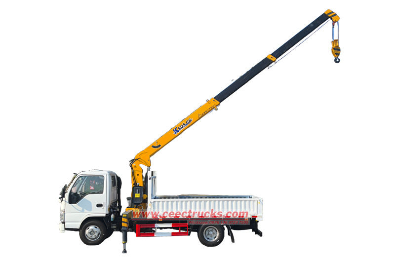 De Isuzu ELF 3,2 ton vrachtwagenlaadkraan biedt een breed scala aan optionele tonnages, waaronder 2 ton, 3,2 ton, 4 ton, enzovoort tot 30 ton. Klanten hebben de flexibiliteit om te kiezen tussen een kraan met rechte arm of een kraan met inklapbare arm.