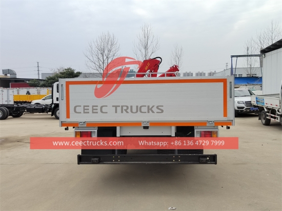 ISUZU 5 tons giekkraanwagen, ISUZU NPR 4×2 chassis met stuur aan de linkerkant, MLD 6-versnellingsbak met handgeschakelde versnellingsbak, ISUZU 190 pk dieselmotor, beroemd Chinees merk 5 tons knikgiekkraan, afmetingen van de laadbak naar wens, lakwerk en logo's afhankelijk van de vereisten.