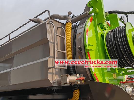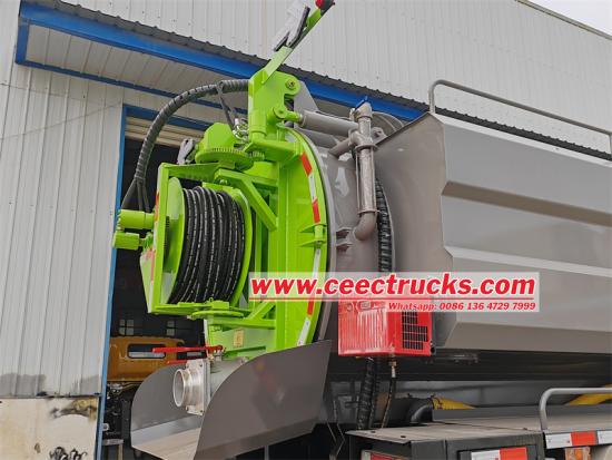 Aan de achterzijde van de gecombineerde tank bevindt zich de slanghaspel, die is ontworpen voor het opbergen van maximaal 120 meter aangeleverde rioolreinigingsslang van 1 inch. De aanvoer en afvoer van de reinigingsslang gebeurt via een hydraulisch systeem met lage snelheid en hoog koppel. |