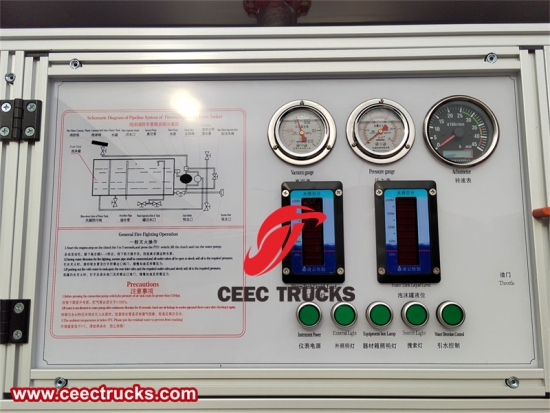 Het bedieningspaneel van de Isuzu FVR 10-tons pompwagen integreert een reeks functies en apparatuur, waardoor brandweerlieden beschikken over een reeks praktische en intuïtieve tools waarmee ze snel kunnen reageren en actie kunnen ondernemen bij diverse brandnoodgevallen. Deze krachtige en intelligente centrale is een van de sleutels tot de efficiënte bediening en brandbestrijding van brandweerwagens en belichaamt de kracht van technologie en menselijke wijsheid bij het beschermen van levens en eigendommen.
