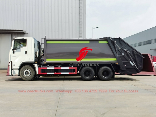 ISUZU GIGA Afvalcompressorwagen (ook wel genoemd vuilniswagen, ISUZU GIGA vuilniswagen met achterlader, vuilniswagen met fabrieksprijs, ISUZU GIGA afvalwagen, afvalverwerkingswagen, fabrikant van afvalpersen) is Ontworpen voor het dagelijks transport van afval in woonwijken zoals alle soorten steden, grote stations, havens en kades, luchthavens en dichtbevolkte gebieden zoals industriële en mijnbouwbedrijven en militaire eenheden.