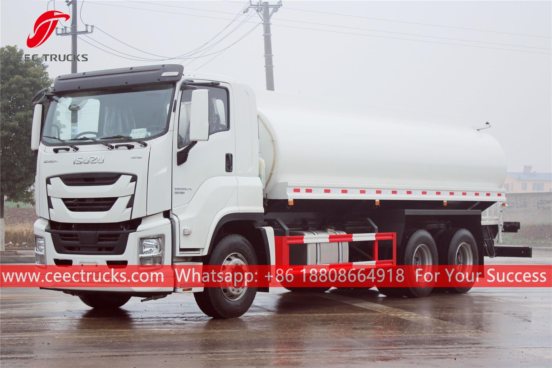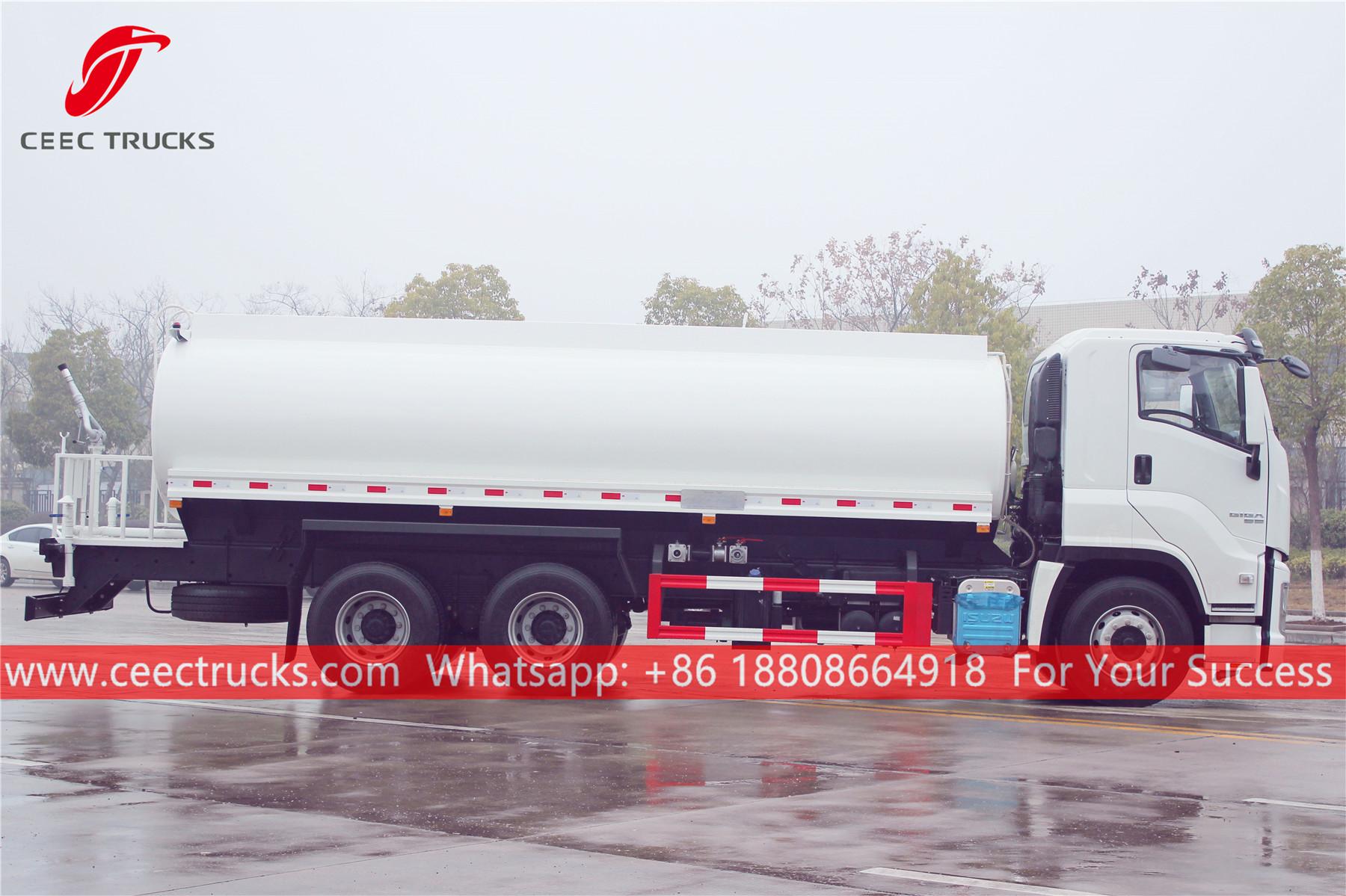 ISUZU 20.000L watertruck, ISUZU GIGA chassis met stuur links, ZF handgeschakelde versnellingsbak met 16 versnellingen, ISUZU 380 pk dieselmotor, waterpomp van een bekend merk, met optionele sproeiers voor, midden en achter. Alle lakwerk en logo's zijn naar wens.