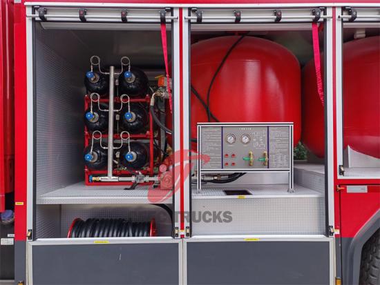 4000L dry powder tankDe Isuzu GIGA bluswagen met droog poeder/stikstof is een efficiënte en veelzijdige brandblusser die een sleutelrol speelt bij branden op belangrijke locaties. De Isuzu GIGA 6x4 bluswagen met droog poeder/stikstoftank combineert twee blusmiddelen: droog poeder en stikstof. Het blusprincipe is zeer uitgebreid. Droog poeder smelt bij hoge temperaturen en vormt een dunne film die het oppervlak van het brandende object bedekt, zuurstof isoleert en zo verbranding remt. Sommige droge poeders, zoals natriumbicarbonaat, ontbinden bij hoge temperaturen, waarbij vrije radicalen vrijkomen en de kettingreactie van verbranding wordt verstoord. Stikstof, als inert gas, kan de zuurstofconcentratie in de lucht verdunnen om het doel van verstikking en blussing te bereiken. Bovendien absorberen stikstof en droog poeder warmte tijdens het spuiten, verlagen ze de temperatuur van het brandende object en spelen ze een verkoelende rol.