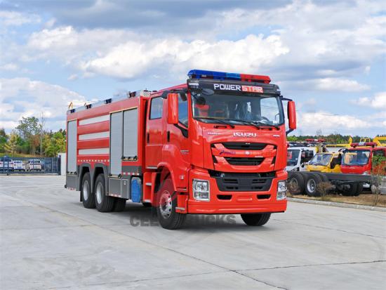 Dit is een blusvoertuig met stikstof en droog poeder, gebouwd op een ISUZU-chassis. Het voertuig is uitgerust met een krachtige ISUZU 6UZ1-TCG61-motor met een cilinderinhoud van 9,839 liter en een vermogen van 380 pk. Het voertuig heeft een 6x4-rijmodus en een versnellingsbak met 12 versnellingen. De maximumsnelheid kan 90 km/u bereiken, wat geschikt is voor verschillende complexe wegomstandigheden. Het brandbeveiligingssysteem bestaat uit twee koolstofstalen bluspoedertanks van 2000 liter en twaalf stikstofcilinders van 80 liter met een ontwerpdruk van 15 MPa. De brandpomp wordt aangedreven door een aftakas, met een drukbereik van 1,6-2,5 MPa en een debiet van 80-120 kg/s. Het bluskanon heeft een sproeisnelheid van 60-100 kg/s en een bereik van 40-60 meter, wat effectief kan reageren op verschillende brandsituaties. Het voertuig is bovendien uitgerust met een volledige set standaard brandreddingsuitrusting, zoals scheppen, koevoeten, bijlen en snijgereedschappen, enz. Ladders en schijnwerpers zijn optioneel.