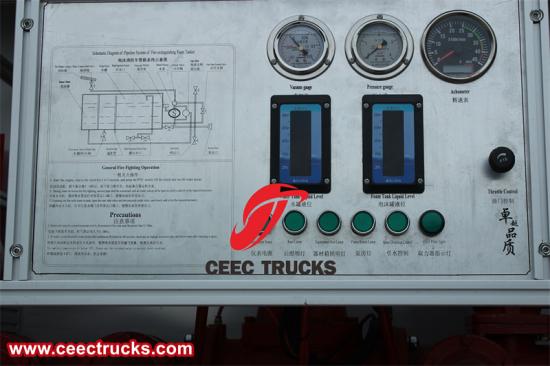 De Isuzu GIGA 8x4 bluswagen met droog poeder en waterschuim is voorzien van een uitgebreid en gebruiksvriendelijk bedieningspaneel dat de machinist voorziet van alle benodigde informatie en bedieningselementen.