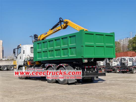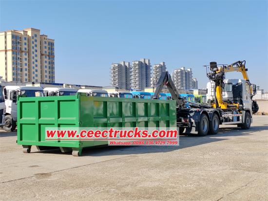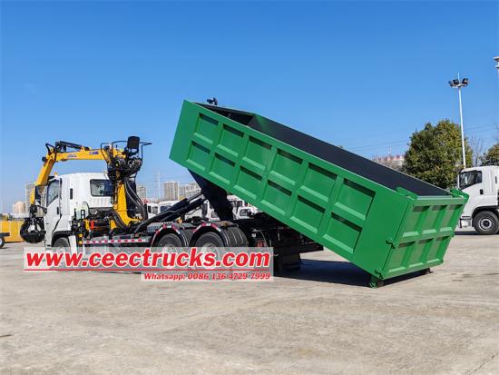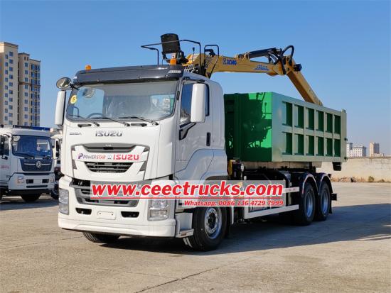 Isuzu zware haakarm kiepwagen met container. Het betreft een Isuzu haakarm kiepwagen met een inklapbare kraan, gebruikt voor het grijpen en heffen van zware goederen. De achterkant van de kraan is een gebroken stalen grijper. De kraan is een XCMG LQS120 laadkraan, met een maximaal hefgewicht van 18 ton en een maximaal hefmoment van 12 ton. Het voertuig is aangepast op een Isuzu VC61 6X4 chassis, uitgerust met een 6UZ1-TCG61 380 pk motor, een snelle 12-versnellingsbak en de afmetingen van de kiepwagen zijn 8200*2300*1200 mm, met 6 zijkanten en 8 onderkanten.