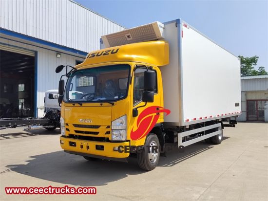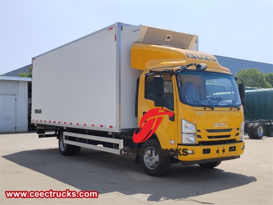 ISUZU NPR koelwagen, ISUZU linksgestuurd model 4×2 chassis, MLD handgeschakelde zesversnellingsbak, ISUZU 190 pk motor. Uitgerust met Carrier koelunits voor hoge prestaties, de bestelwagencapaciteit is optioneel verkrijgbaar met een capaciteit van 5-25 ton.
