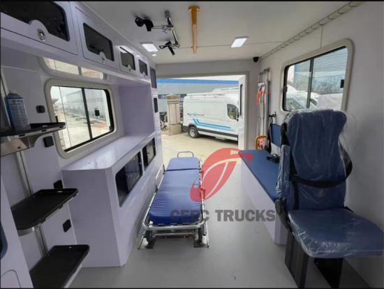 2. Geavanceerde medische apparatuur en een menselijk ontwerp Het interieur van de medische cabine is uitgerust met uitgebreide en geavanceerde EHBO-uitrusting. Het automatische laadbrancardsysteem vergemakkelijkt niet alleen het vervoer van patiënten, maar vermindert ook de fysieke belasting van het medisch personeel. De onafhankelijk geregelde airconditioning- en verwarmingssystemen zorgen voor een comfortabele omgeving voor patiënten en medisch personeel, terwijl de UV-desinfectielamp en het ventilatiesysteem hygiënische veiligheid garanderen. Daarnaast is de medische cabine ook uitgerust met een compleet zuurstoftoevoersysteem, infuusstandaard, 1000W omvormer en andere apparatuur, die krachtige ondersteuning bieden voor verschillende medische noodbehandelingen. Deze ontwerpen weerspiegelen volledig het diepgaande begrip van medische behoeften, waardoor de ambulance niet alleen een vervoermiddel is, maar ook een mobiel EHBO-station.