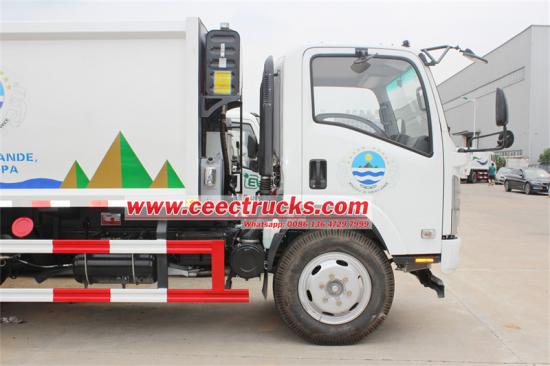 Isuzu rear loader truck with a flip mechanismDe ISUZUNPR 10CBMDe afvalperswagen is een zeer efficiënte machine die speciaal is ontworpen voor stedelijk afvalbeheer. Hij maakt gebruik van geavanceerde perstechnologie om het afvalvolume aanzienlijk te verminderen.Door de transportefficiëntie te verbeteren, het aantal transportritten te verminderen en de operationele kosten te verlagen. Gebouwd op het Isuzu NPR-chassis, dee vuilnis achterlader is uitgerust met een 190PK Euro 6-motor en een zesversnellingsbak, die robuuste prestaties en stabiele rijeigenschappen bieden. Met zijn compacte ontwerp en eenvoudige bediening is de ISUZU10CBM hydraulische afvalpers is geschikt voor afvalinzameling en -transport in verschillende omgevingen, waaronder steden en dorpen.