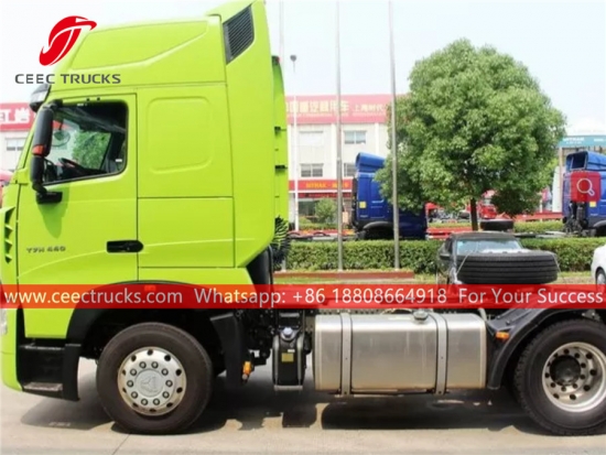 SINOTRUK HOWO 4x2 aandrijfmotor, SINOTRUK 440 pk dieselmotor, handgeschakelde versnellingsbak met 12 versnellingen, maximaal trekgewicht 40.000 kg, lakwerk en logo's op aanvraag.